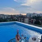 A full kitchen with a dishwasher is among the self-catering amenities provided. Access to a rooftop swimming pool ensures a more relaxing stay.